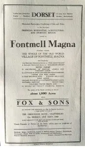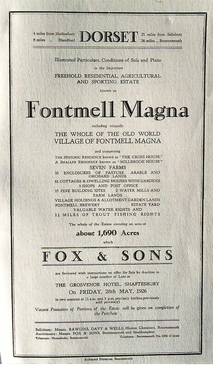 The Sale (held at the Grosvenor Hotel, Shaftesbury on 28th May 1926) contained 110 lots, and was conducted by Fox & Sons, Auctioneers of Bournemouth. There were 1,690 acres including the majority of the village of Fontmell Magna with 33 enclosures of pasture, arable and orchards; 62 cottages and larger dwellings; 3 shops, one with a Post office, 2 main residences, 15 building sites, 2 water mills, a brewery, 7 farms, an estate office and various allotments. The sale grossed a total of £31,100, which is approximately £809,000 in today’s money.