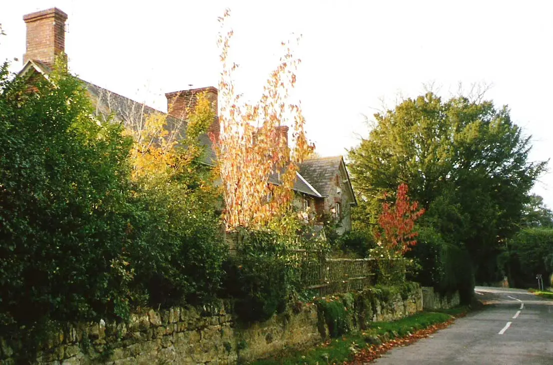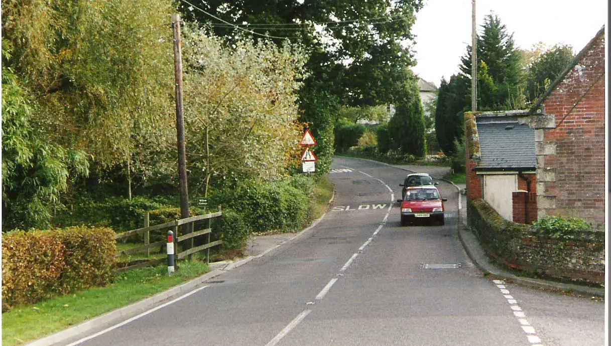 is the very busy A350, a major road from the midlands to the port of Poole on the south coast. In the background there is now new housing and in the street there are now signs warning the traffic that the major road really remains just a country lane.