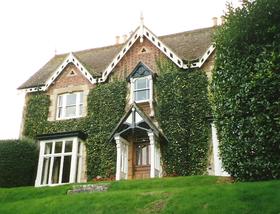 windows, doors and decorative soffits are just the same. The brickwork is mostly now covered with climbing plants and the north end of the house is now hidden behind a large evergreen.
